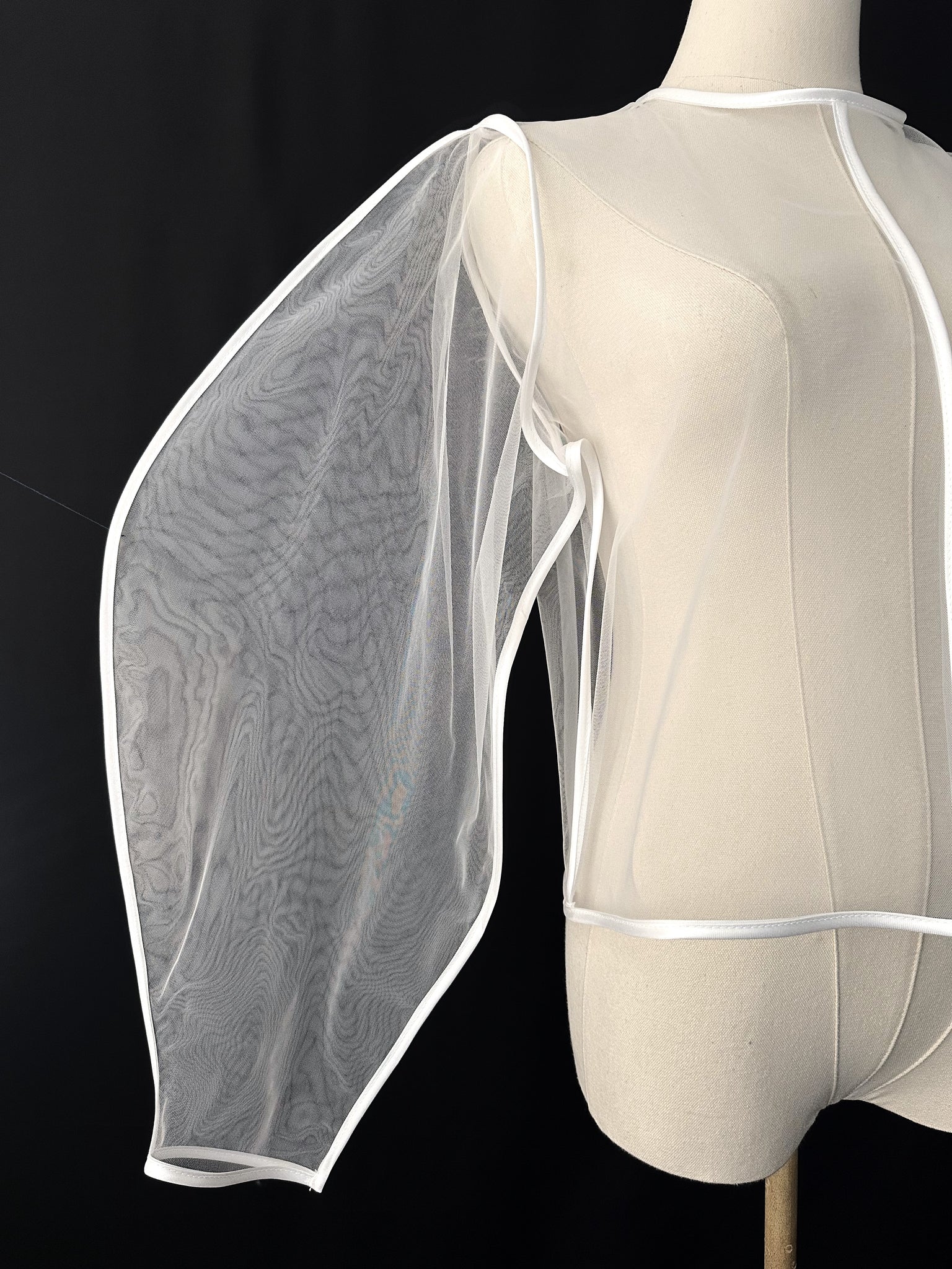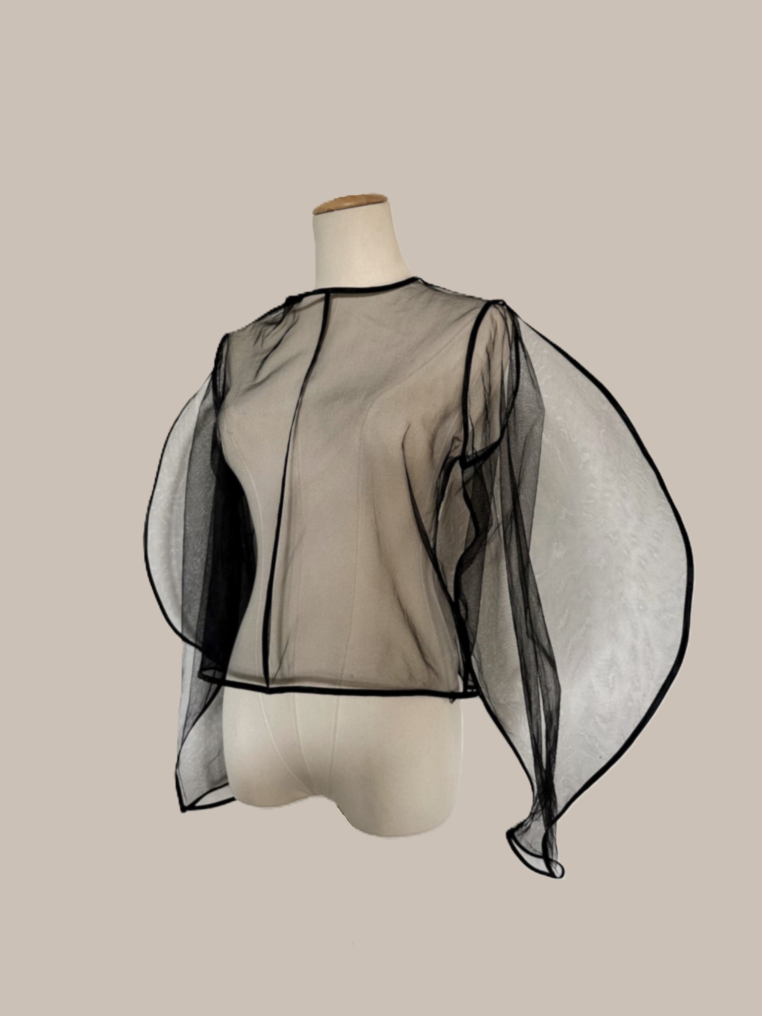 MEISO l Round Cut Blouse. Structured tulle with satin binding on edges. Crew neckline to accentuate the cut. Structured Round Sleeves to create alluring shape. Back keyhole with button for ease of putting on garment.